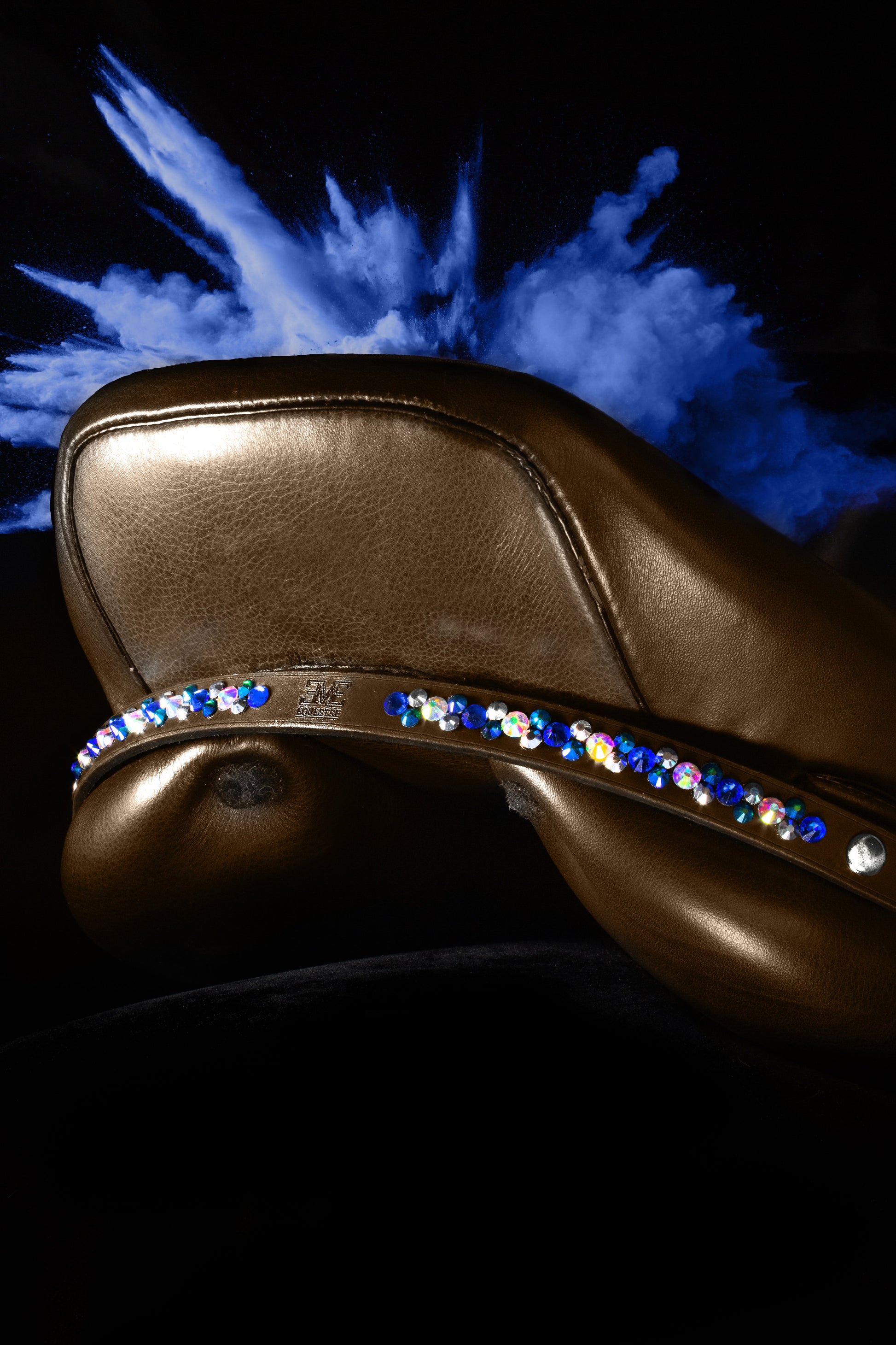 Made with high-quality leather, the Totilas Model, is adorned with graphite and silver embellishments made of crystals, this saddle jewel is truly a work of art. The combination of colors and materials makes it a unique and special piece, with an elegance and sophistication that will make you stand out on any riding arena.