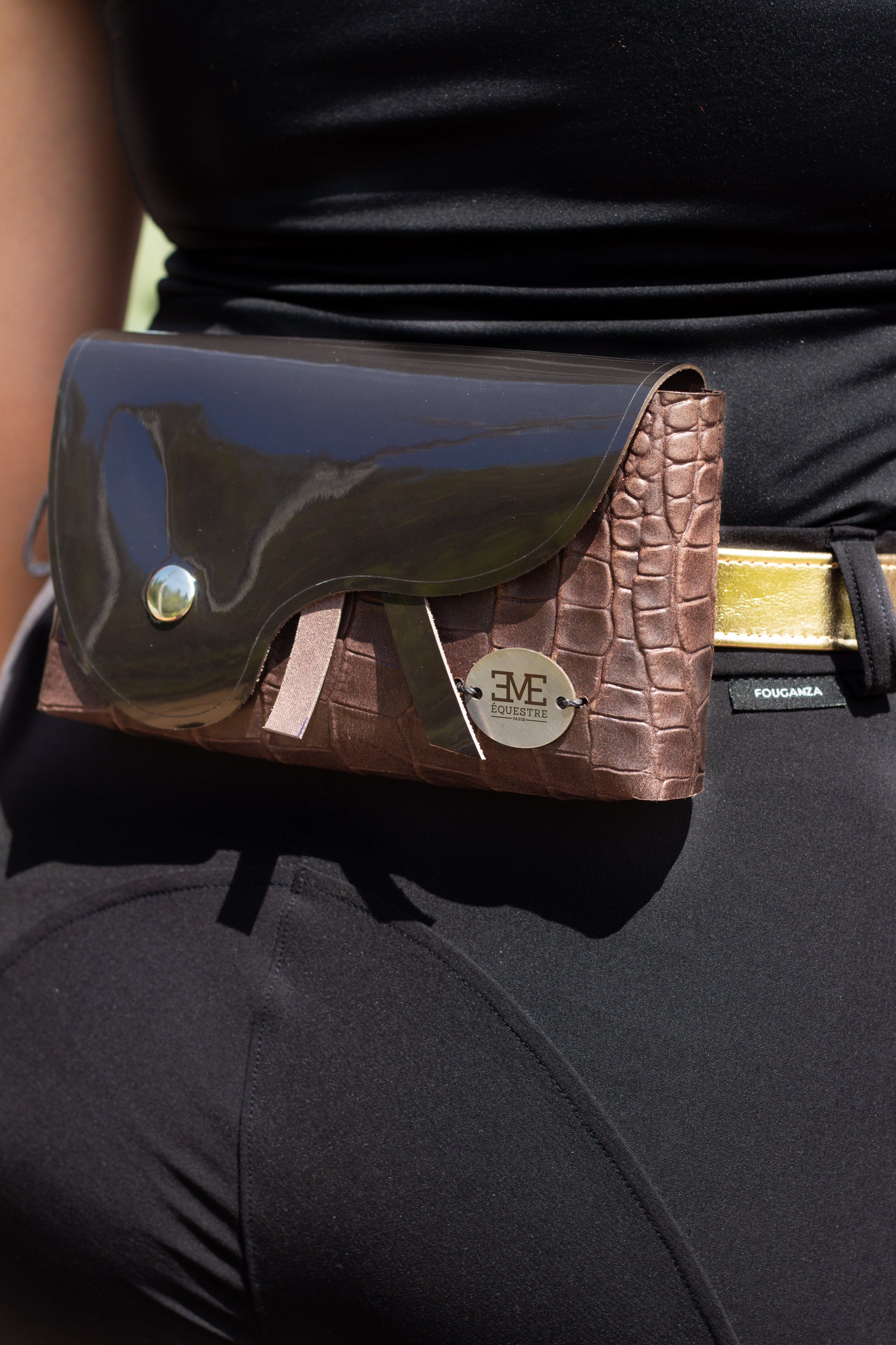 With two color options: black and brown, both with a patent leather and crocodile finish, this Belt Bag is a true jewel for your riding attire. With it, you can carry your personal items while riding such as keys, cards, money and phone, always maintaining an elegant and sophisticated image.